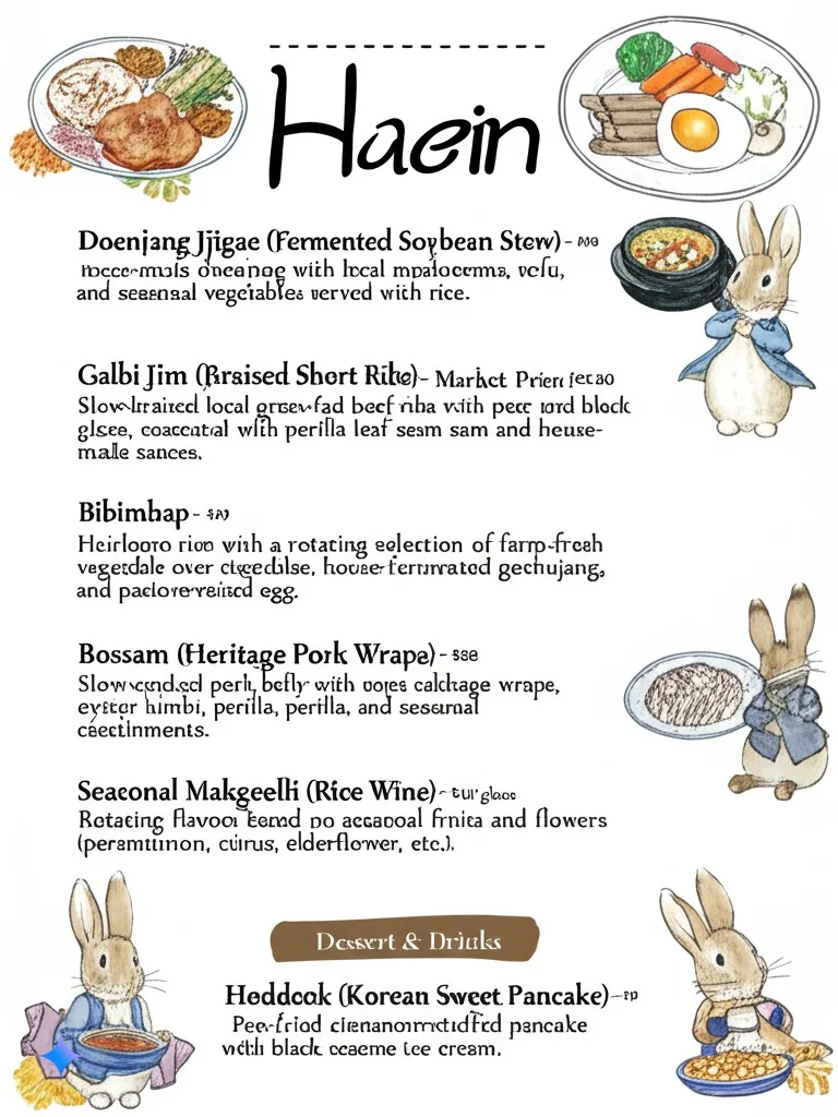 Immediate: “I’m opening a conventional idea restaurant in Marin known as Haein. It focuses on Korean meals cooked with natural, farm-fresh components, with a rotating menu based mostly on what’s seasonal. I would like you to design a picture – a menu incorporating the next menu objects – lean into the standard/rustic fashion whereas preserving it feeling upscale and modern. Please additionally embody illustrations of every dish in a chic, peter rabbit fashion. Be certain that all of the textual content is rendered accurately, with a white background.